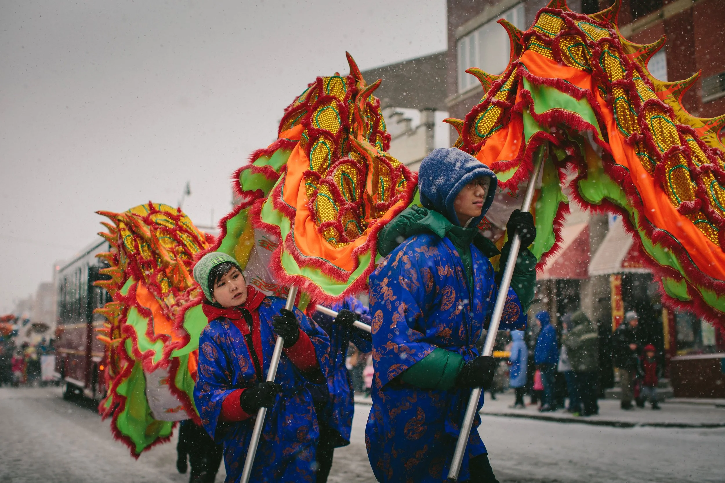 St. Therese Chinese Catholic School seventh graders Wyatt Harley and Victor Ruan bring up the belly of a dragon during the Lunar New Year Parade in Chicago's Chinatown.